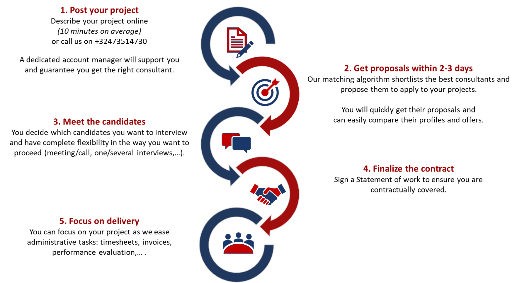 Posting a project is fast, easy and free. No cure no pay: our commission is applicable only when you start working with the consultant.